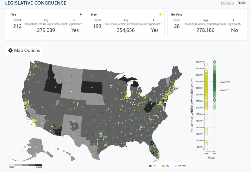 Our Legislative Congruence map was launched in 2026. Check back soon for a prototype and a link to our technical report (or email clio). This map allows us to compare the outcome of bill votes in Congress to different characteristics of congressional units.